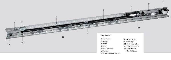 Companents. 1.MiniDriveUnit 2.Transformer 3.Motor 4.Decoder 5.Control unit 6.Run and installation profile 7.Door Carriage 8.Detection roller 9.Service cover holder 10.End stopper 11.Door suspension with adjustment device 12.belt connection